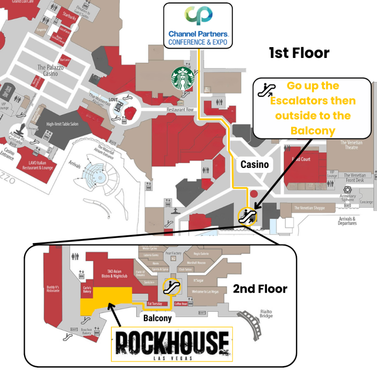 Exit the Expo Hall on the 1st floor and walk past Starbucks and turn left toward the casino. Once you reach the casino, stay to your right as you enter and continue walking through the Venetian casino floor. Move toward the center of the casino and head straight for the escalators. Take the escalators up to the 2nd floor. When you reach the top, go through the doors to the balcony. Turn right and walk down the hallway.