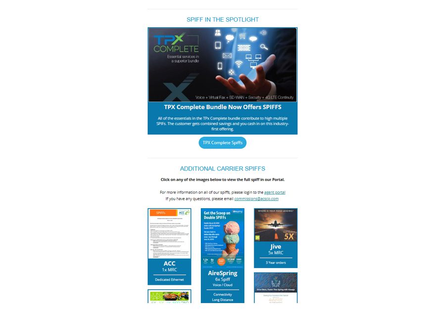 Every month we receive new spiffs from our providers that our agents have the opportunity of receiving. ACS Cloud Partner bonuses are also included in this list as we like to show our appreciation for your continued partnership.
