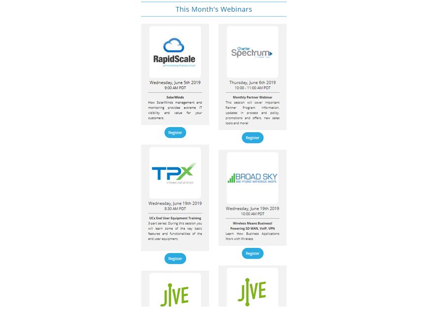 We send monthly newsletters which include a sales spotlight, a list of provider spiffs and bonuses, industry updates, insights or trends, partner success stories, case studies, marketing collateral, upcoming webinars, and any other information regarding this industry and how to see results.
